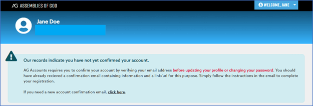 - After clicking Confirm Account, you’ll be taken to this Email Confirmation screen. You can now make changes to your profile, if desired, or go to giving.ag.org to log in and begin managing your contributions.